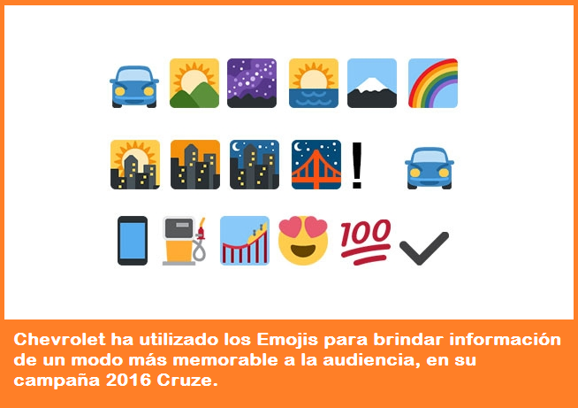 La empresa automovilística Chevrolet tomó la decisión de desafiar al público a un reto en las Redes Sociales, como parte de su campaña de lanzamiento del modelo Chevy Cruze 2016. Para ello hizo público un brief del nuevo modelo “redactado” exclusivamente con emojis, tras lo cual se invitó a la audiencia a descifrar el sentido del mensaje.