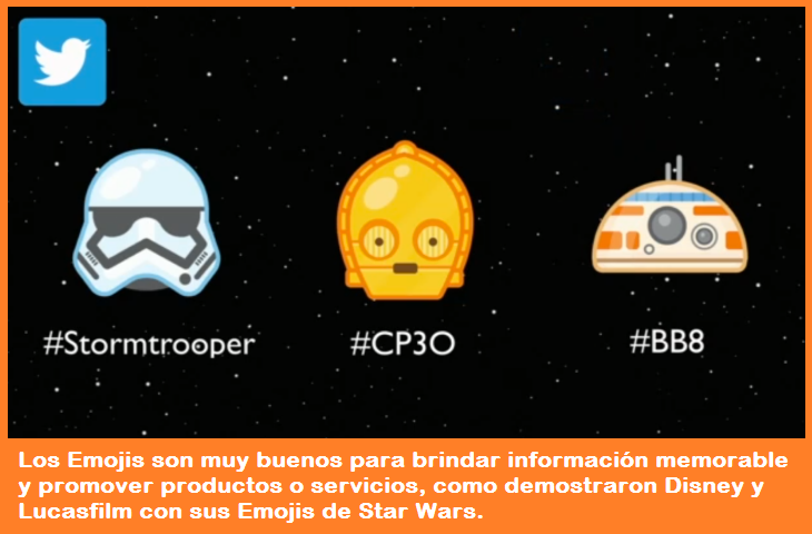 Tal es el caso del lanzamiento de Star Wars en 2015, cuando Disney y Lucasfilm decidieron apelar a los Emojis en Twitter para promover los personajes más queridos de la Saga, e incorporarlos en la conversación de las personas. Así los usuarios podían escribir hashtags en sus tweets, que luego se mostraban automáticamente como Emojis de los personajes.