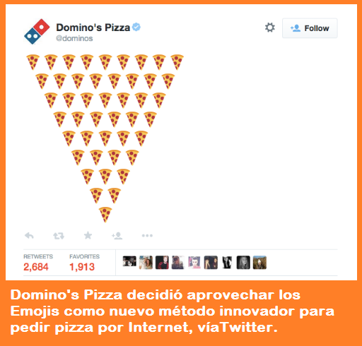 Así, por ejemplo, la compañía estadounidense Domino’s Pizza decidió aprovechar la inmediatez informativa de los Emojis para llevar los pedidos de pizza en Internet a otro nivel. Para ello invitaron a la audiencia a ordenar pizza de forma online mediante el Emoji de la porción de pizza.