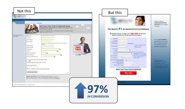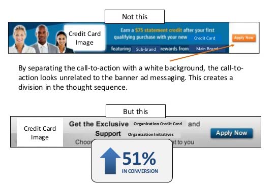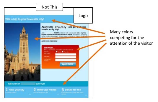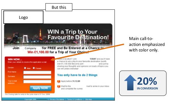 O erro neste caso, é que a cor gera distração ao colocar o botão de Call To Action (CTA) fora do formulário e no meio do recorrido visual que o usuário realiza através da página. Na versão otimizada, a cor do botão de CTA é mais intenso e é colocado no pé da página, “obrigando” o usuário a atravessar com sua vista todo o formulário para finalmente chegar ao botão de CTA, guiando a ação. Resultado: 97% mais de CTR.
