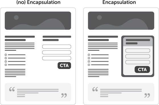 Não deixe que a mensagem ou o ponto de interesse em que deseja concentrar toda a atenção fique obsoleto ou perdido entre os outros elementos de sua landing page. Encapsule o botão para incorpora-lo à mensagem e chamar corretamente a atenção.