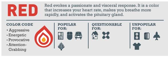 Vermelho é: agressivo, energético, provocativo e chama a atenção. É popular entre as indústrias relacionadas a: comida, tecnologia, automóveis e agricultura.
