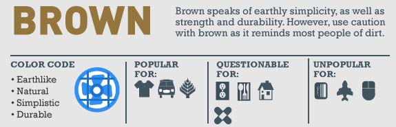 Marrom evoca: terreno, natural, simplicidade, duradouro. É popular entre as indústrias relacionadas a: roupa, automóveis e agricultura.