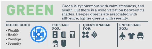 Verde evoca: riqueza, saúde, prestígio, serenidade. É popular entre as indústrias relacionadas a: comida, tecnologia, finanças, energia, habitação.