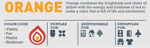 Laranja evoca: vitalidade, diversão, exuberância, alegria. É popular entre as indústrias relacionadas a: tecnologia e cuidado com a saúde.