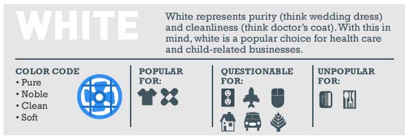 Branco evoca: pureza, limpeza, suavidade. É popular entre as indústrias relacionadas a: roupa e cuidado com a saúde.