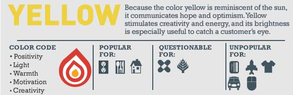 Amarelo evoca: positivismo, luz, calidez, motivação, criatividade. É popular entre as indústrias relacionadas a: comida, energia e habitação.