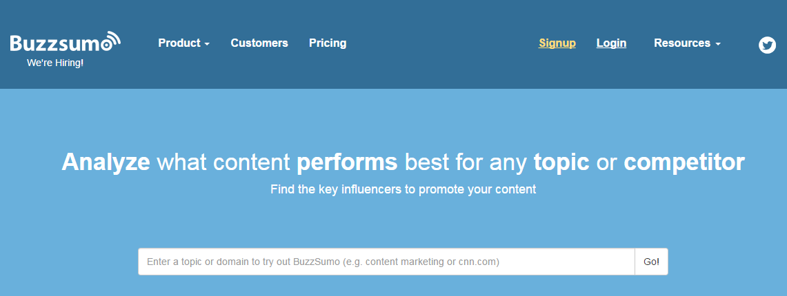Buzzsumo permite que você insira um tópico ou domínio no buscador e o mesmo vai fornecer informações sobre quais são os conteúdos mais compartilhados nas redes sociais. Assim, você pode facilmente saber quais são os conteúdos que causaram maior impacto no seu público e, consequentemente, definir o tipo de postagem que seus seguidores demandam.