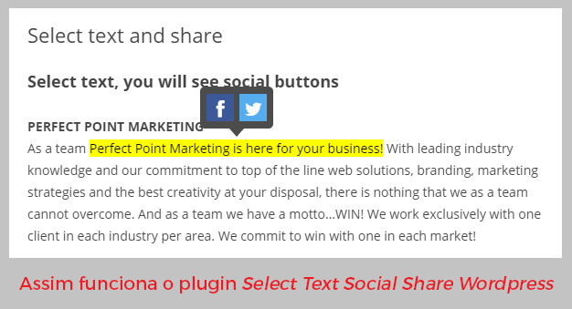 Outro plugin muito interessante que você pode usar na sua página é o Select Text Social Share WordPress. Depois de instalado, seus leitores vão poder publicar frases do seu artigo no Twitter e no Facebook simplesmente selecionando o fragmento que queiram compartilhar, basta marcar o texto e apertar o ícone da rede social de destino.