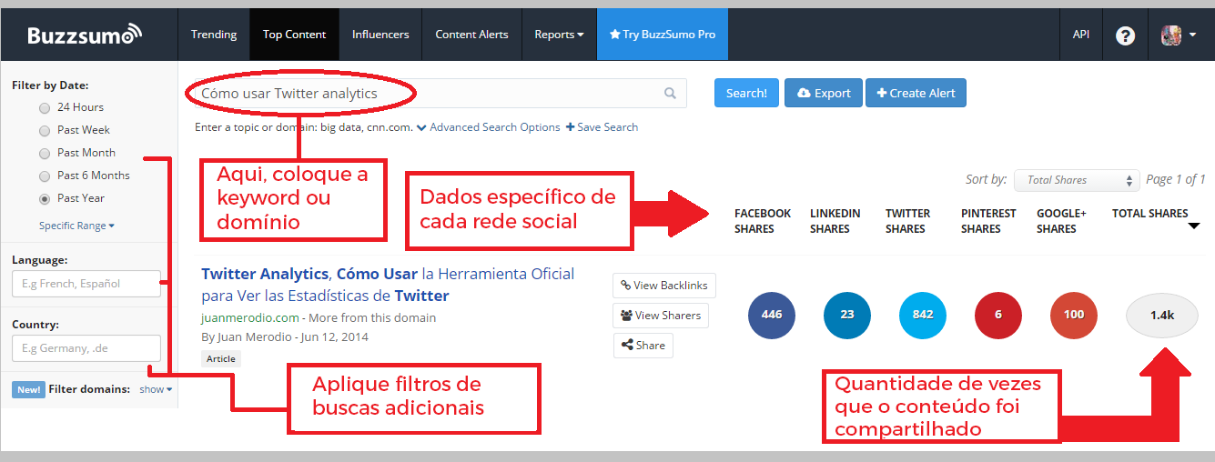 Depois de colocar a keyword que você quer avaliar, Buzzsumo mostra o impacto dos conteúdos relacionados à palavra-chave nas redes sociais. Isso inclui a quantidade de vezes que foi compartilhado no Facebook, LinkedIn, Pinterest e Google+, além de quantas vezes foi tuitado. A ferramenta também permite que você aplique filtros geográficos, por idioma e tempo para ter mais precisão nos resultados.