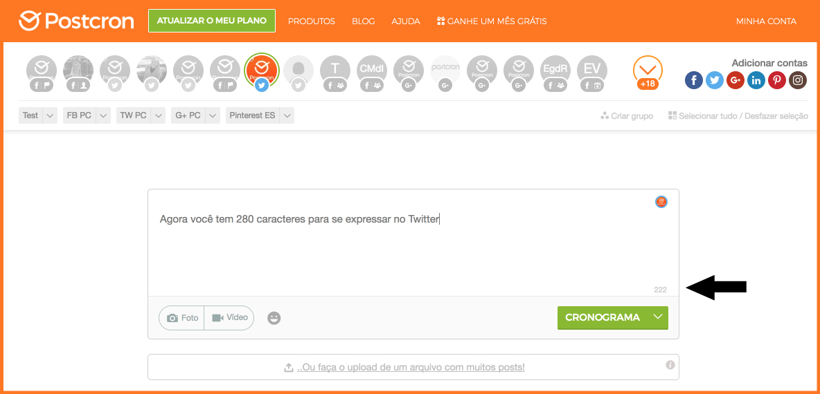 Em Postcron, não perdemos tempo e já nos atualizamos: você pode agendar seus tweets de 280 caracteres tanto a partir do publicador manual como por meio da opção de agendamento massivo de postagens.