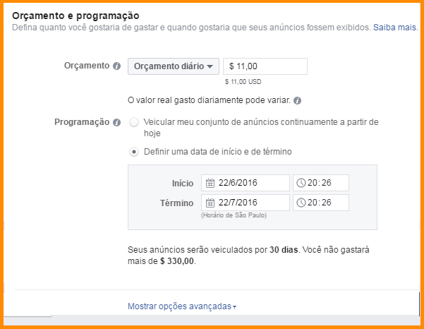 Agora que você já segmentou o seu público e sabe a quem se destina o seu anúncio, é hora de definir o orçamento diário e duração da campanha, isto é, se você quiser que a campanha comece imediatamente ou se prefere indicar uma data de início e de término.