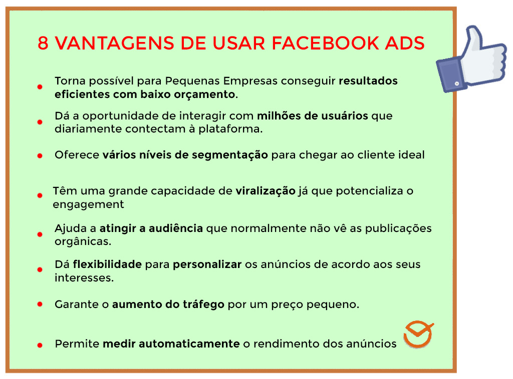Se você está se perguntando por que deveria investir em Facebook Ads, na imagem abaixo mostramos 8 motivos para apostar em publicidade no Facebook, e olha que há muitas outras vantagens que você vai descobrir durante o caminho.