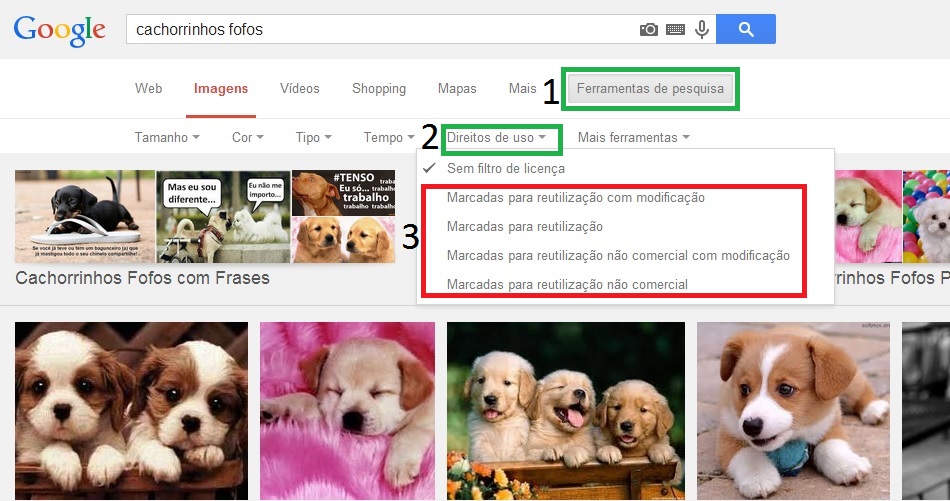 Se você não deseja pagar um banco de imagens, tudo bem, use as imagens do Google, mas para ter certeza de que você está usando as que correspondem, deve selecionar aquelas imagens habilitadas para modificação e utilização pelos direitos de uso. Para saber fazê-lo, veja os seguintes passos: