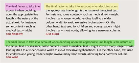 - Um texto estreito: é menos trabalhoso para o olho passar de uma linha para a outra, mas por sua vez, diminui a velocidade da leitura, já que não há informação suficiente para que o leitor possa ir enlaçando as ideias.