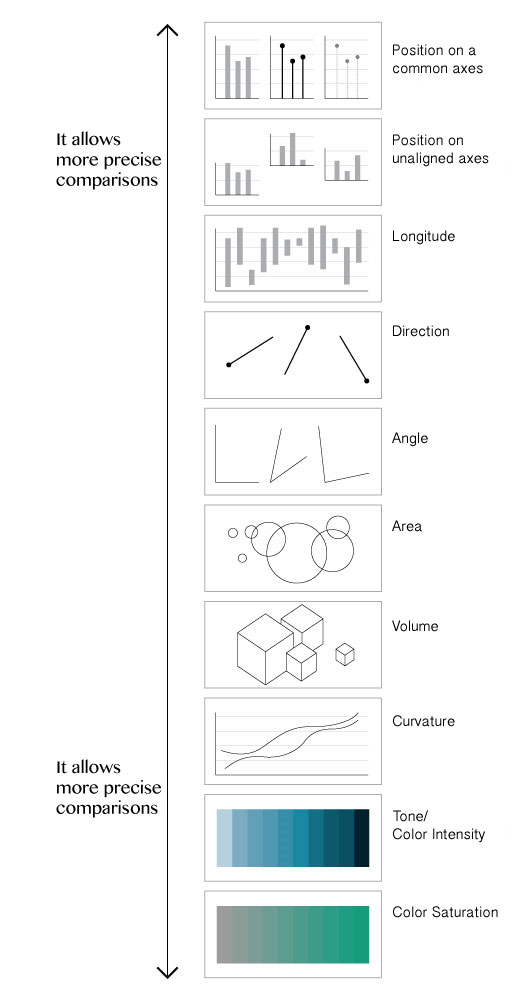 No artigo “Graphical Perception: Theory, Experimentation, and Application to the Development of Graphical Methods“, dois pesquisadores, William S. Cleveland e Robert McGill, apresentaram o que chamaram de tarefas perceptivas elementares: Dez métodos para codificar dados visuais. Classificam-se numa escala de “melhor a pior”. Os primeiros da lista são os que o cérebro melhor interpreta e compreende.