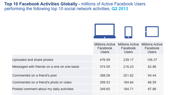 Já havíamos adiantado anteriormente em nosso post sobre “Tendências e Estatísticas de redes sociais 2014”,e seguimos confirmando com outros trabalhos de campo que se fizeram a respeito: as imagens são o formato que mais se consome, e ao mesmo tempo: ver, compartilhar e fazer upload de fotos, vídeos, é a atividade que mais se realiza no Facebook.