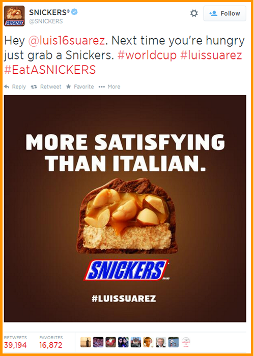Para isso, é vital aproveitar o fator atualidade, e é exatamente isso que a Snickers fez quando o fotebolista uruguaio Luis Suárez mordeu um rival italiano na Copa do Mundo de 2014. Textualmente, recomendaram: “a próxima vez que tiver fome, coma um Snickers”, marcando o próprio jogador e adicionando o slogan “mais satisfatório que um italiano”. O tweet teve cerca de 40.000 retweets.