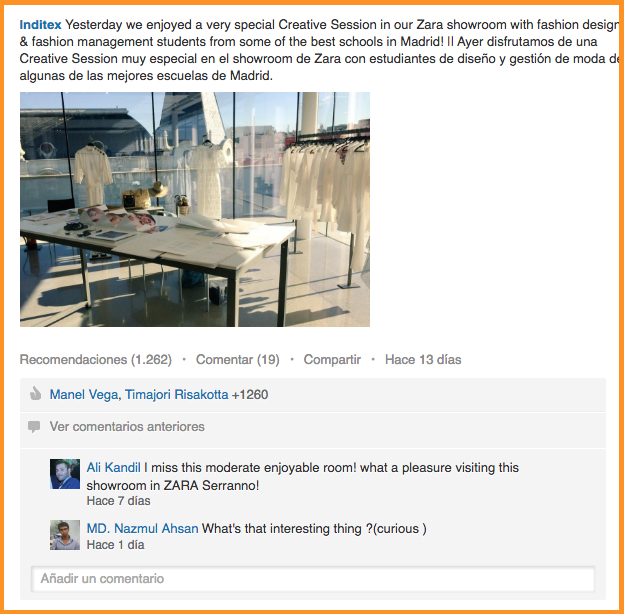 - Mostre às pessoas o que há por trás do seu negócio — que tal uma foto do escritório para que vejam que há gente “de carne e osso”?— Isso gera engagement e confiança ao mesmo tempo. A Zara faz isso muito bem no LinkedIn: