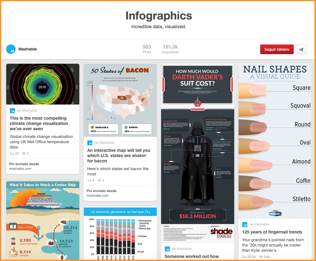 É isso que a Mashable faz, e possui um quadro dedicado exclusivamente a infográficos, onde combina conteúdo divertido com outro informativo, e assim mantém a sua audiência interessada. Resultado? O seu quadro de infográficos tem mais de 191.300 seguidores!