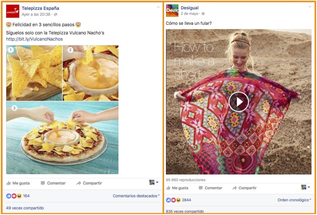É justamente isso que a Telepizza fez, mostrando em três passos simples como comer a sua nova pizza Vulcano Nacho’s, ou a marca ds moda Desigual, que criou um vídeo mostrando as diferentes maneiras de vestir um cachecol —peça que eles mesmos vendem—.