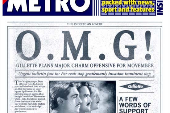 Gillette escreveu seus anúncios de uma forma que combina com o estilo estético Vintage de publicidade retrô, com os modismos da geração atual, utilizando termos como “omg”, que significa “oh my god” em inglês, e é mais provável que seja utilizado por alguém de 17 anos, a ouvi-lo da boca de uma avó. O copy disse algo parecido a (já que nenhuma tradução será suficientemente fiel): “Boletim urgente de última hora: Ou seja, sério (stop), invasão super masculina iminente (stop)”.