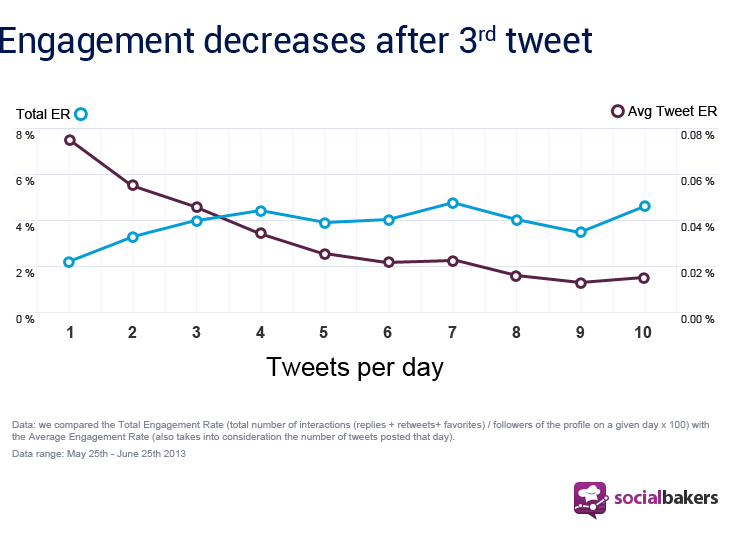 A SocialBakers realizou um estudo e descobriu que o engagement baixa ligeiramente a partir do terceiro Tweet. A prova consistiu em publicar até 10 vezes por dia e cruzar o Total Engagement Rate (ER) com o Average Engagement Rate (Avg ER).
