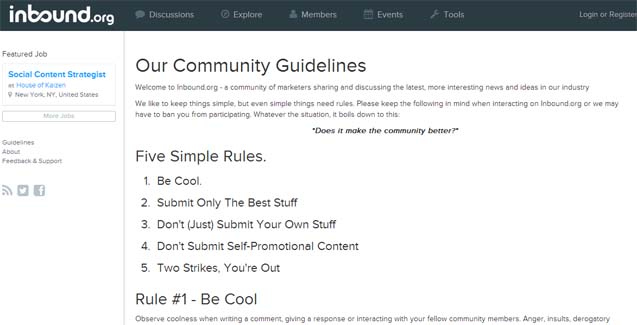 Um exemplo excelente de como, através das diretrizes, se pode estabelecer as bases que darão forma ao espírito, identidade e cultura de uma comunidade é: Inbound.org