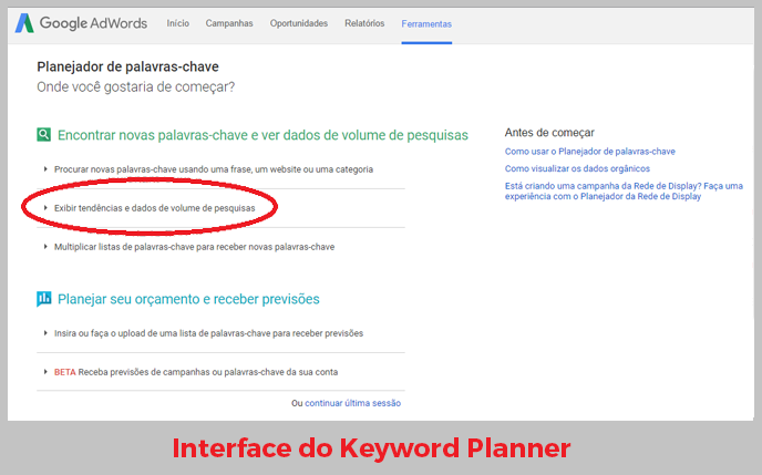 Para usar o Keyword Planner, você só precisa ter uma conta no Google. Depois de entrar na plataforma, coloque os dados do seu país de origem, fuso-horário e moeda. Uma vez que termine esse passo, a página mostra uma opção para criar campanhas, mas você pode saltar essa etapa e ir diretamente para o Planejador de Palavras-Chave, como se vê na imagem abaixo.