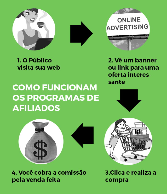 Como você pode ver na imagem, trata-se de uma forma muito simples de ganhar dinheiro por comissão. Tudo que você precisa para participar desta modalidade de negócios é ter um blog que gere conteúdo frequente e de qualidade. Assim, você coloca links e avisos da companhia afiliada. Algumas das páginas mais conhecidas por seus programas de afiliados são: