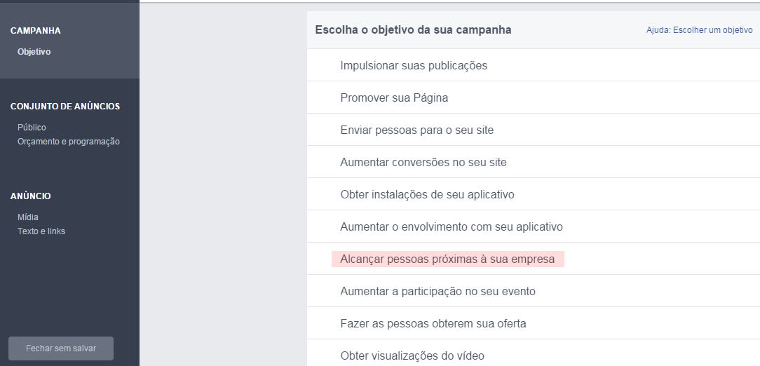 Entre as opções do Gerenciador de Anúncios, há uma que se chama “Alcançar Pessoas Próximas à Sua Empresa”. Bingo, essa alternativa faz com que a sua campanha saia na linha do tempo de quem vive próximo a você, seja ou não seu fã. Digamos que é um tipo de folhetagem virtual.