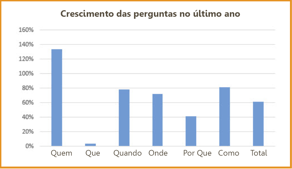 Então, já sabe: use perguntas. Se você não tem ideia por onde começar, olhe o gráfico abaixo, onde mostramos quais são os tipos de perguntas mais frequentes que os usuários fazem. Quando for criar seus conteúdos, otimize-os e use isso ao se favor!
