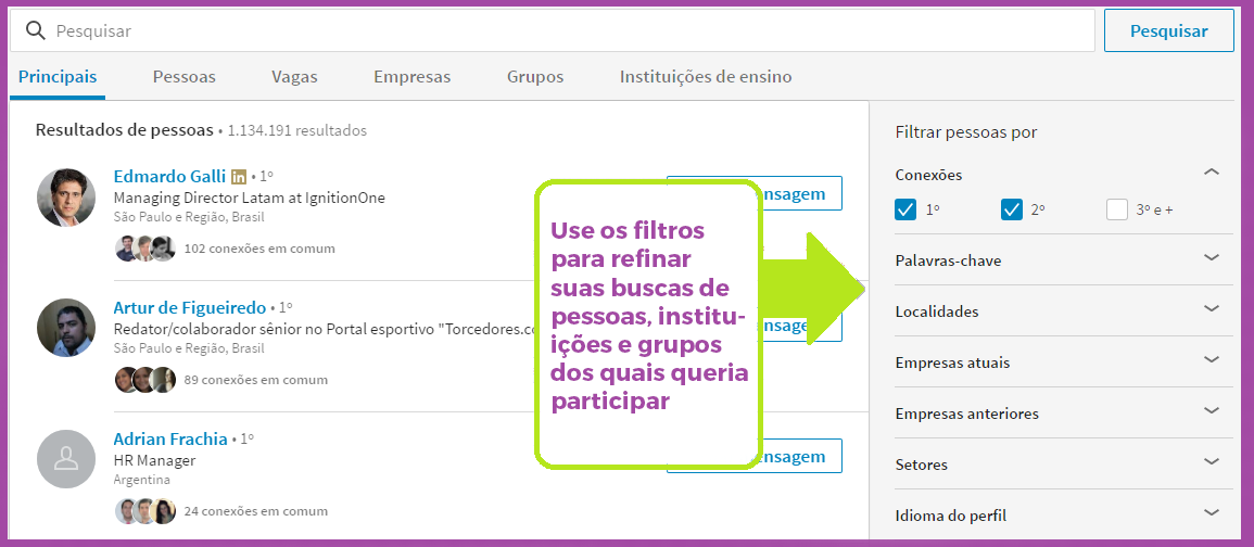 Além disso, os grupos são lugares ideais para conhecer outros profissionais do seu setor. Inclusive as configurações padrão de alguns grupos permitem que os membros possam mandar mensagens privadas entre si, no próprio LinkedIn.