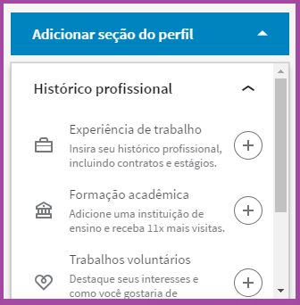 Uma ótima maneira de divulgar suas experiências e habilidades, é adicionar seções no seu perfil do LinkedIn. Eles não só beneficiam a sua imagem profissional, mas o seu perfil mais interessante de conhecer. Para adicionar seções, que você simplesmente deve ir em “Editar perfil” e clicar em uma das muitas seções oferecidas pelo site.