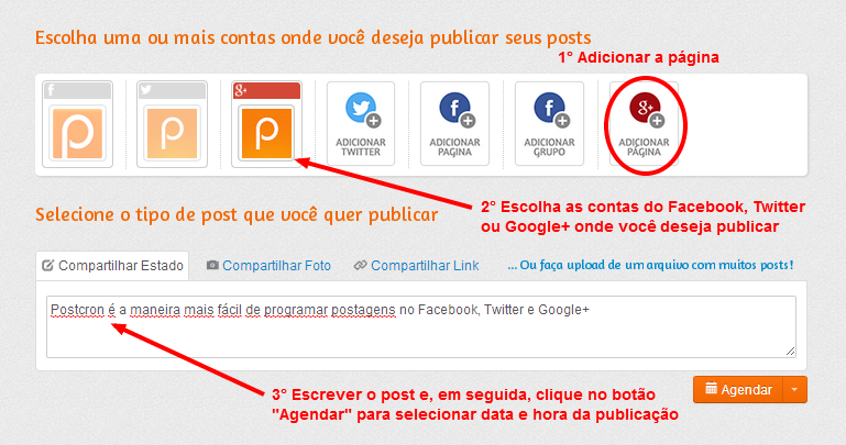 4. Para postar, escreva o post onde diz “Compartilhar estado” e selecione as contas do Google+, Twitter e Facebook onde você deseja publicar. Para confirmar, clique no botão “Agendar” para especificar a data e a hora da publicação. Pronto!