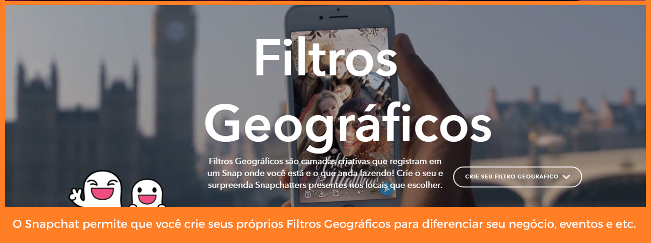 Uma das vantagens do Snapchat é que a plataforma permite que você crie Filtros Geográficos para promover visualmente seu negócio nas diferentes localidades de origem dos usuários que exploram pelo aplicativo. Os Filtros Geográficos são imagens sobrepostas ou logotipos que mostram onde um usuário está em um determinado momento.