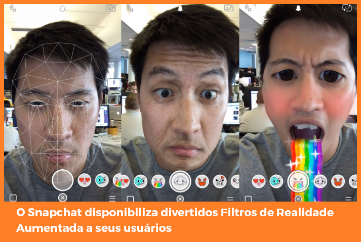 Entre as propostas mais inovadoras do SnapChat, sem dúvida, destacam-se os Filtros de Realidade Aumentada. Trata-se de uma tecnologia que permite captar a realidade por meio de um dispositivo (por exemplo, pela câmera do celular) e aplicar elementos digitais, tais como animações, desenhos, fotos, textos, etc.