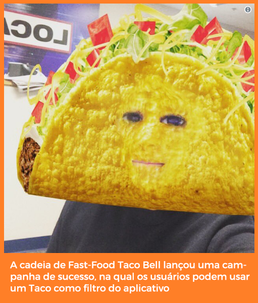 A famosa rede fast food Taco Bell aproveitou o Snapchat com estilo e bom-humor, quando começou a usar a tecnologia dos filtros de Realidade Aumentada para promover seus próprios produtos. Por isso, criou o Filtro ‘cara de taco’, que as pessoas podem usar também em seus rostos, como uma máscara cômica.