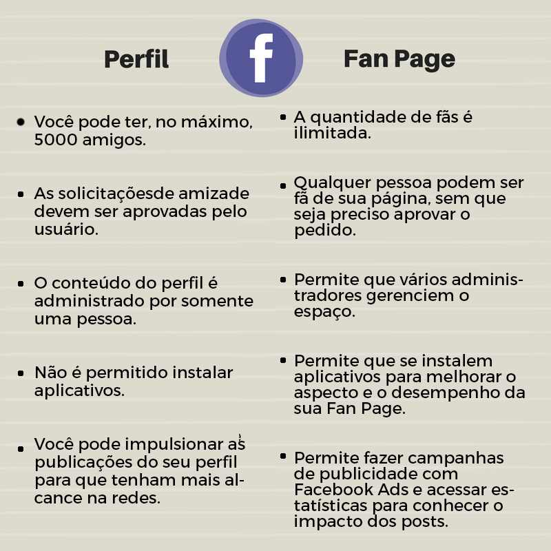 Agora, vejamos em detalhe quais são as diferenças entre as Páginas, ou Fan Pages, e os Perfis do Facebook.