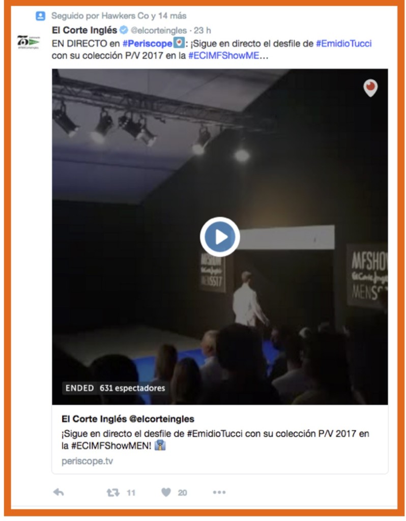 O Corte Inglês, um dos maiores líderes mundiais de grandes armazéns, incorporou as retransmissões via Periscope à sua estratégia de Social Media, como neste caso, em que mostra o desfile de Emidio Tucci ao vivo (em espanhol):