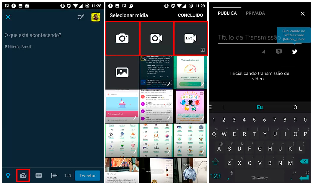 - Por último, você pode fazer uma transmissão ao vivo via Periscope (os vídeos ao vivo não têm limite de duração).