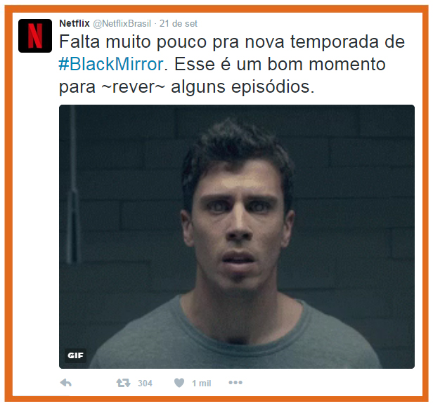 A Netflix, por exemplo, sempre publica teasers das estréias e das novas temporadas, como no caso da série BlackMirror: