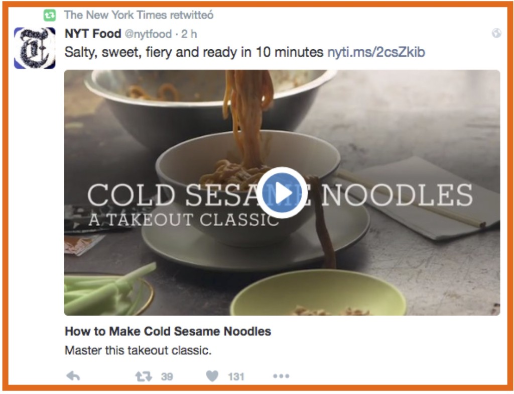 O New York Times, por exemplo, tem uma conta no Twitter especificamente dedicada a comidas, onde compartilha receitas usando os vídeos nativos da plataforma.